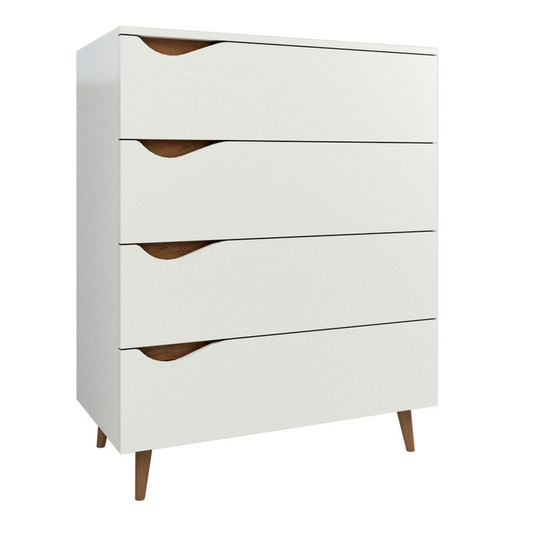 این دراور تمام ام دی اف و از جنس بهترین ام دی اف ساخت داخل (پاک چوب) می باشد. دارای 4 کشو بدون منگنه با تکنیک شیار زنی است که موجب می شود استحکام بیشتری نسبت به نوع منگنه کوب داشته باشد. دارای ریل سه تکه بوده که باعث میشود کشو ها تا حد اکثر اندازه ممکن از بدنه خارج شوند. پایه های چوبی و بدون دستگیره بودن درها و نیز شکل خاص منحنی بودن آنها زیبایی خاصی را به محصول می بخشد.