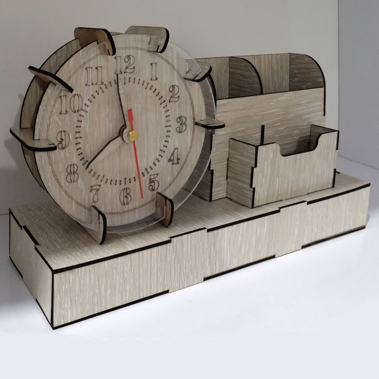 یک استند رومیزی که علاوه بر قابلیت نگهداری انواع خودکار، خودنویس و مداد را دارد، با داشتن سه محفظه مجزا قابلیت نگهداری انواع کاغذ، جای کارت و برگ تقویم و کاغذ یادداشت را دارد. دارای یک ساعت رومیزی آرام گرد با محافظ عقربه ها از شیشه ای پلکسی می باشد. جنس آن از ام دی اف سه میل می باشد. استند زیرین آن قابلیت نصب هرگونه پلاک لیزری را دارد و می توان از آن به عنوان هدیه در اداره جات، مدارس و غیره استفاده کرد.